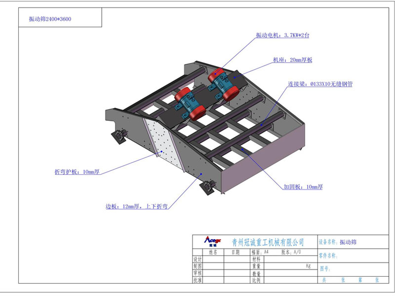 規(guī)格:2400*3600mm 振動電機(jī):3.7KW*2臺 邊板厚度:12mm 料斗:板厚5mm |